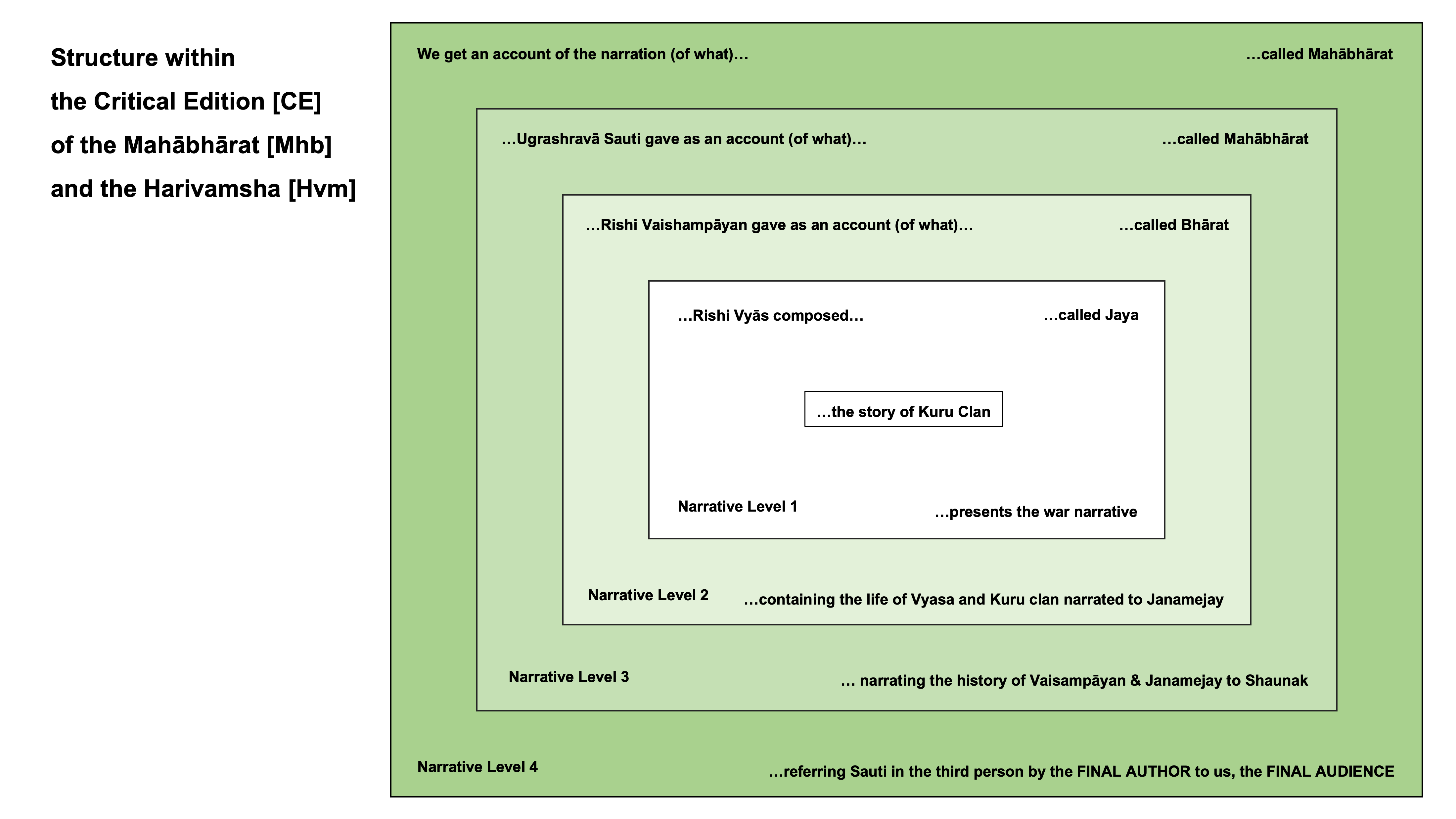 Explaining the structure in epic helps to see the various frames in terms of narrative layers[Note 1]. There are four narrative layers of storytelling in the Mhb CE: