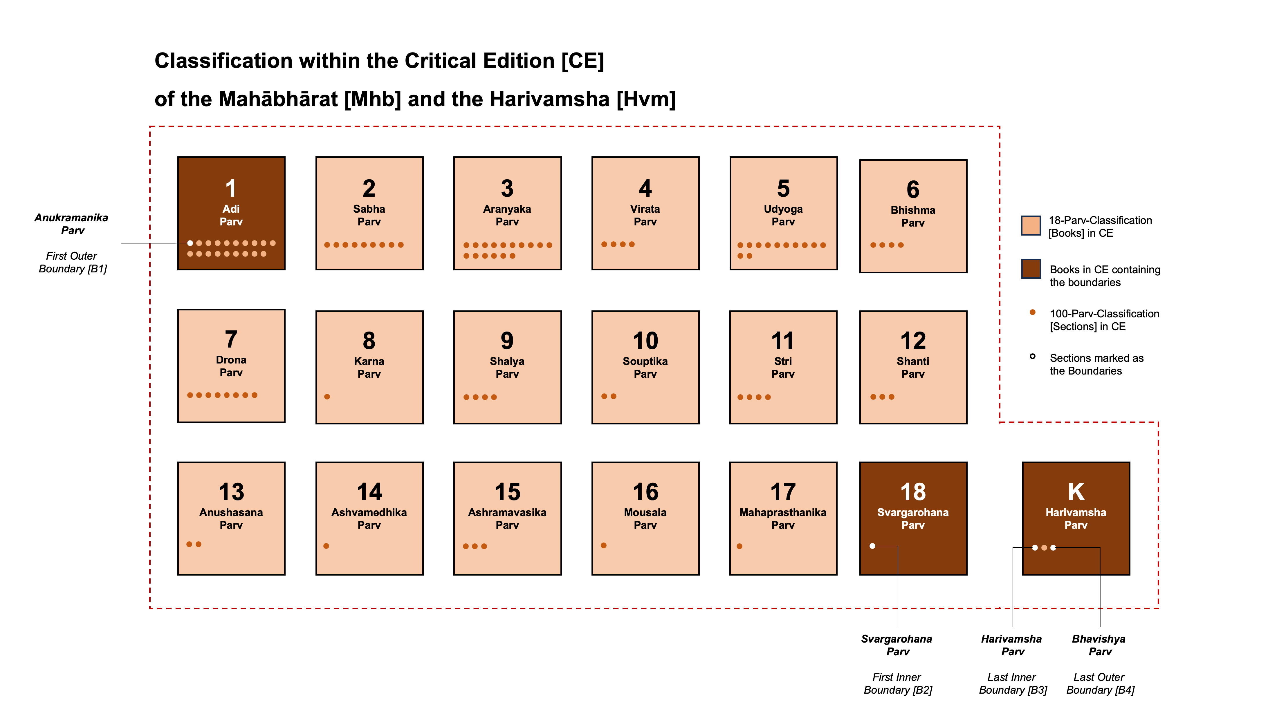 Mhb CE's table of contents showcases 18-Parv-classification [what we will refer to as Books] and 100-Parv-classification [what I am referring to as Sections]. It is important to note that Mhb CE only kept 98 sections of 100 that were supposed to be there.